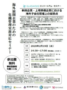 既に海外子会社をお持ちの新興企業・上場準備会社や、海外の子会社展開をご検討の会社におかれまして、貴重な機会ですので、是非ともご参加を賜り、今後の貴社の取り組みにご活用ください。